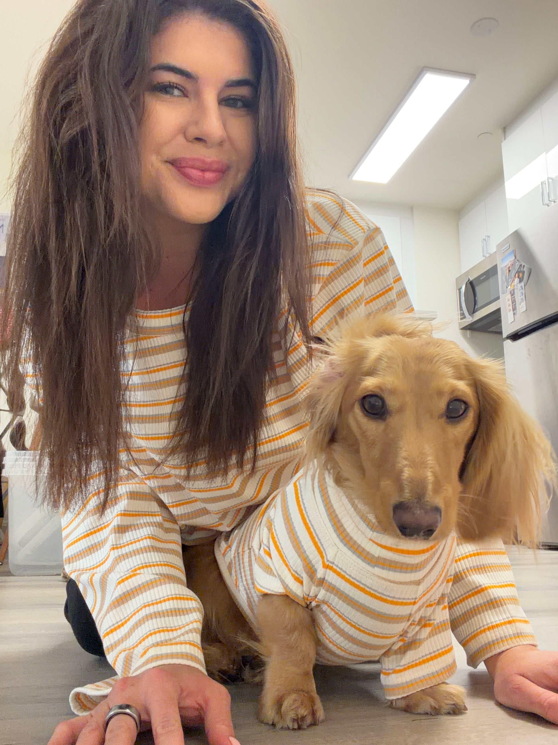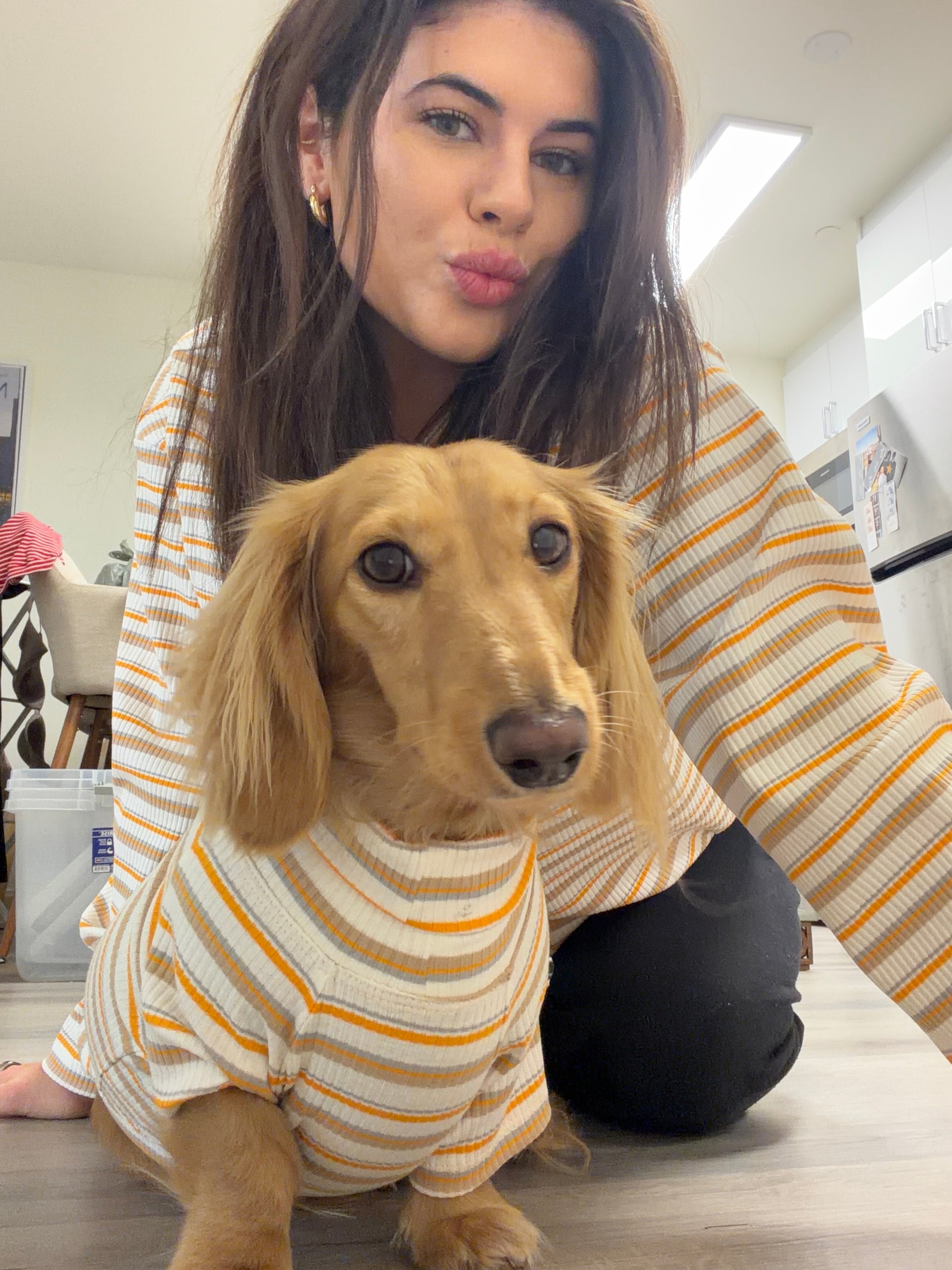 You and your pup’s new go-to for cozy days and golden-hour strolls. The Caramel Drizzle Matching Set blends warm, sweet charm with an effortless neutral vibe, featuring soft ribbed fabric in creamy beige, warm caramel, and soft grey stripes. Designed for pups who love looking stylish without trying, and for humans who appreciate a chic, aesthetic moment that matches every season.