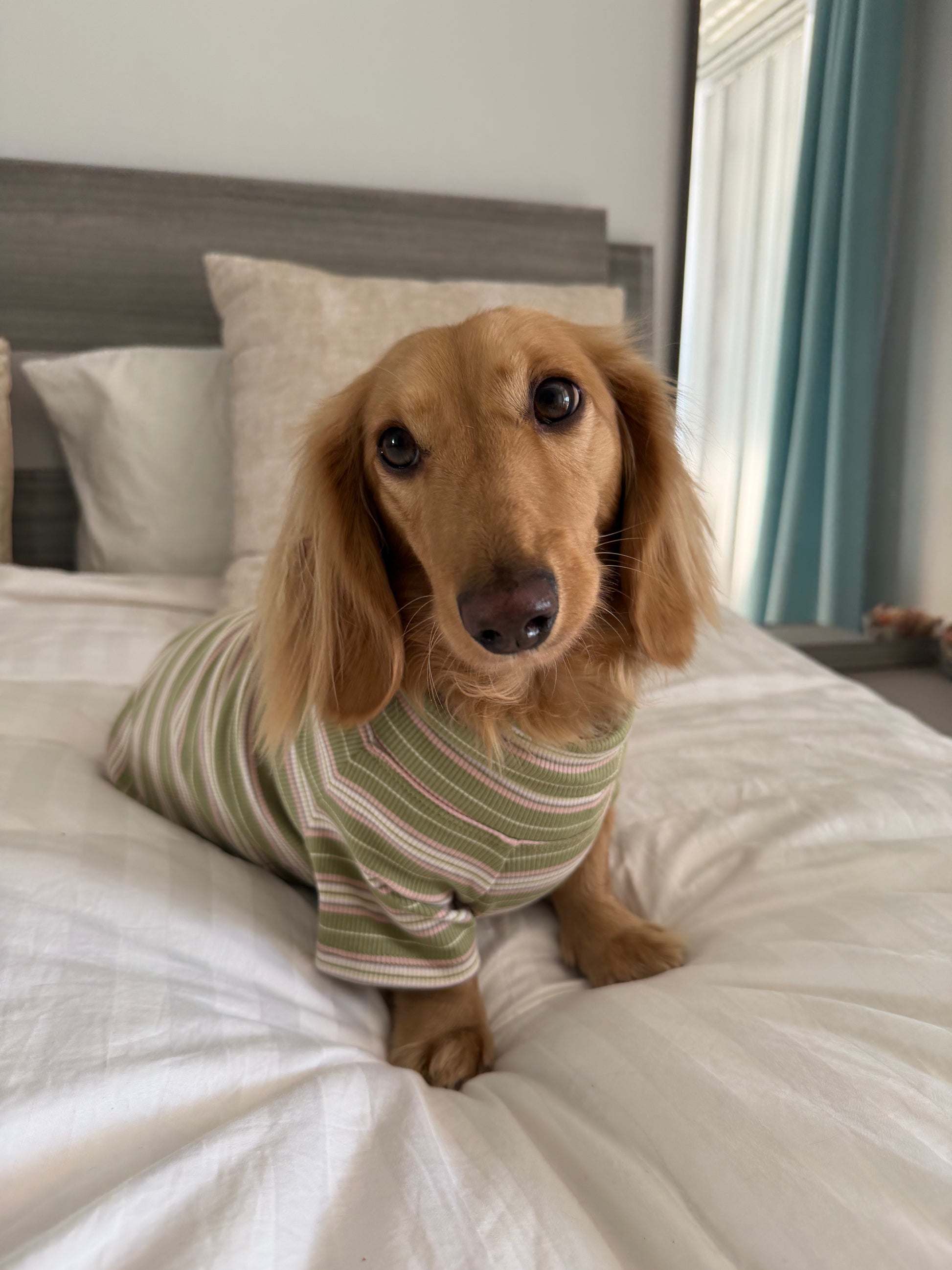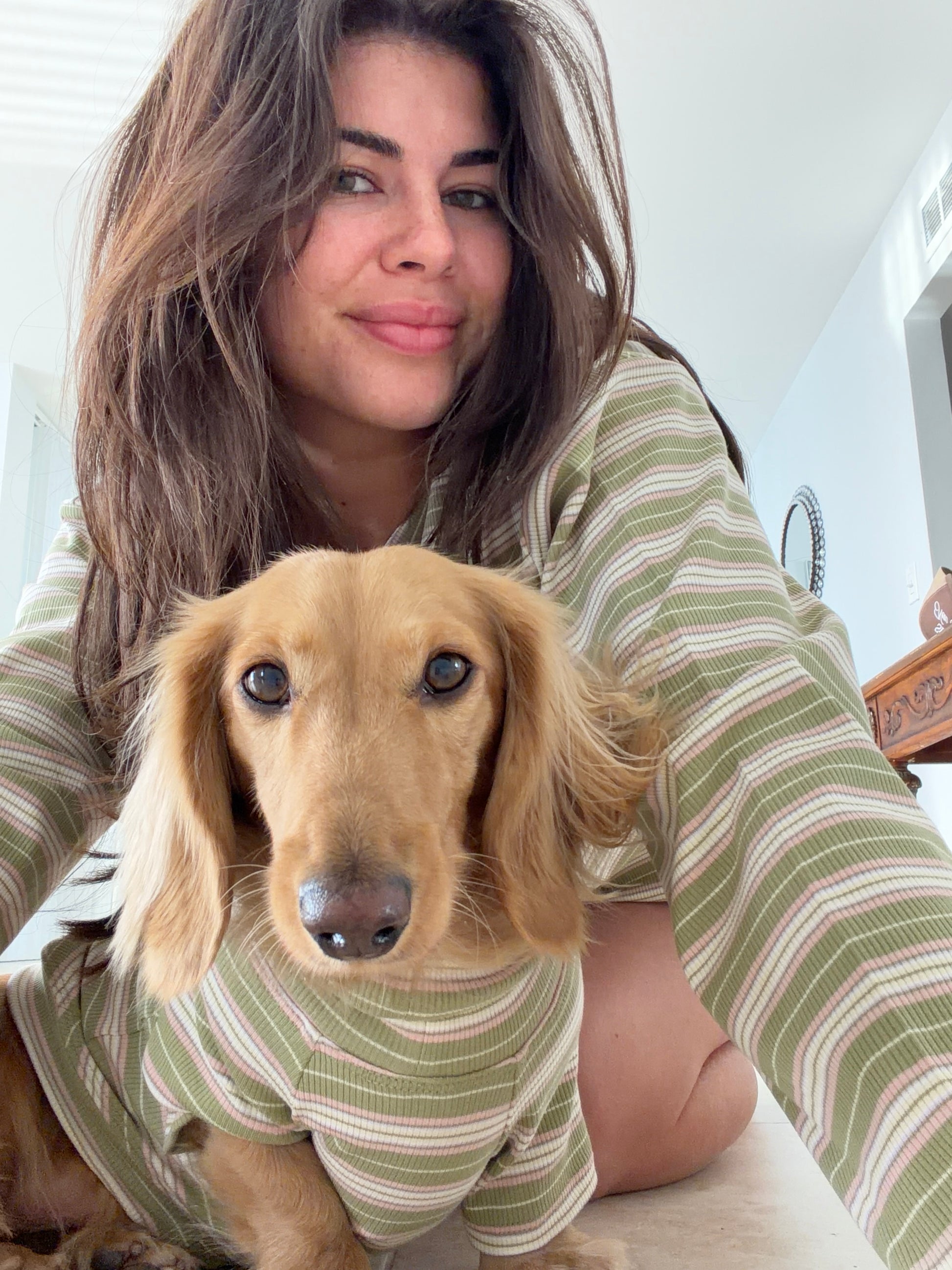 Your pup’s new go-to for cozy days and winter strolls. The Evergreen Dog Shirt blends soft holiday charm with an earthy, neutral vibe, featuring ribbed fabric in warm sage green and blush-cream stripes. Designed for pups who love to look effortlessly stylish, seasonal, and snug (and for humans who appreciate a subtle, elevated holiday moment).