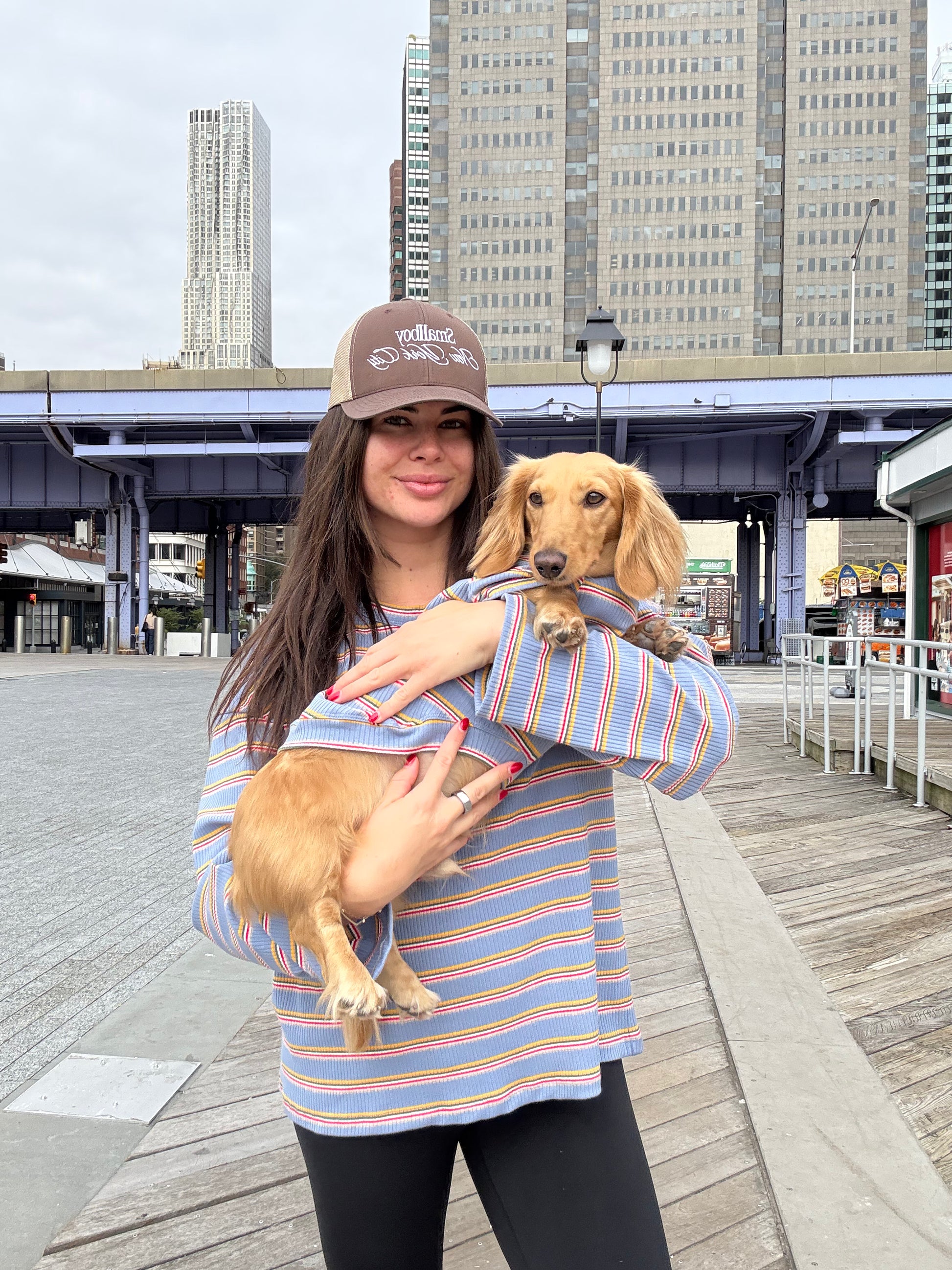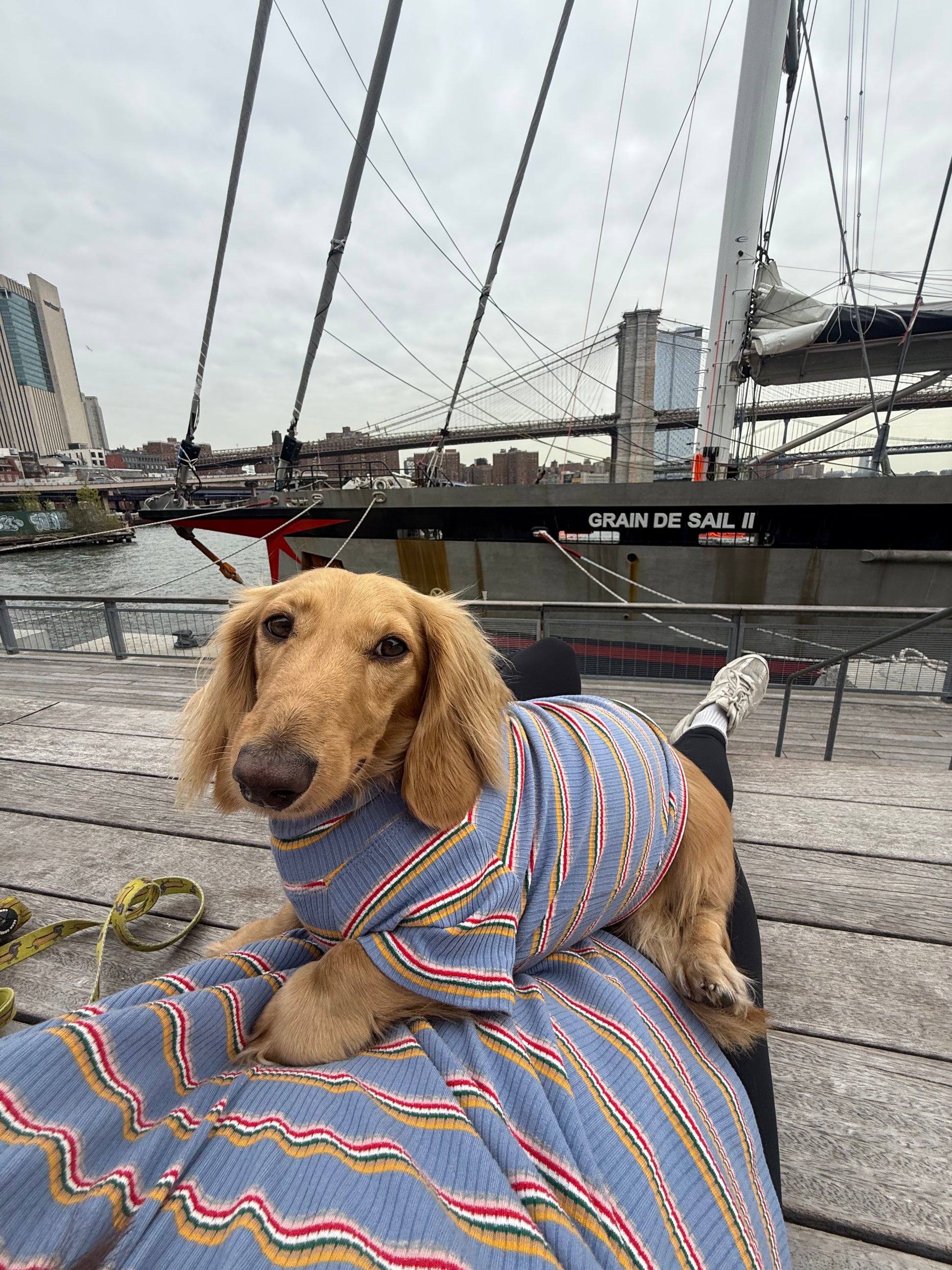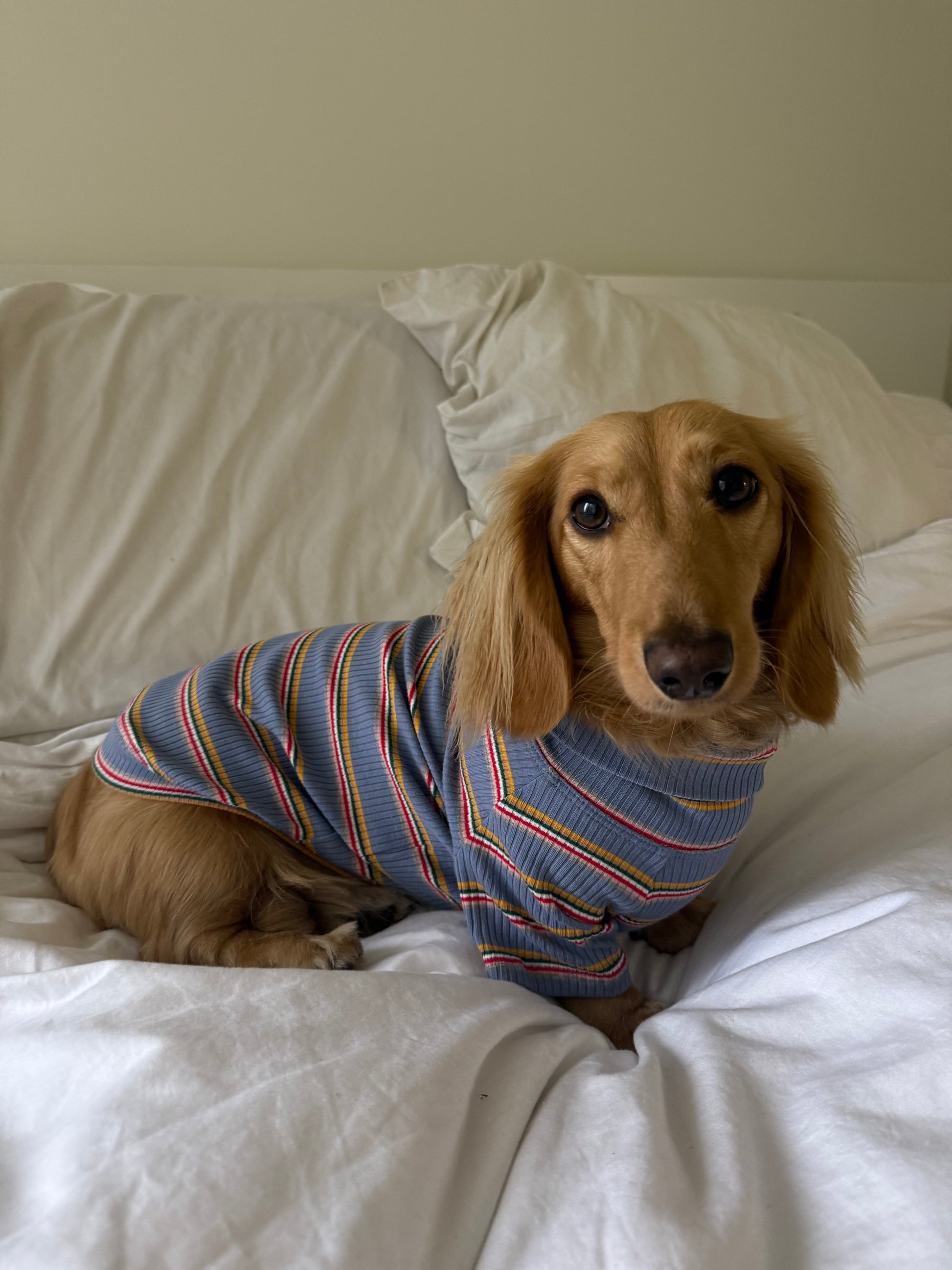 Our dog Charlie (pictured here) is a standard sized dachshund, wears a size small (and can fit into a medium, too) and weighs about 17.5lbs and I am wearing a S/M here.