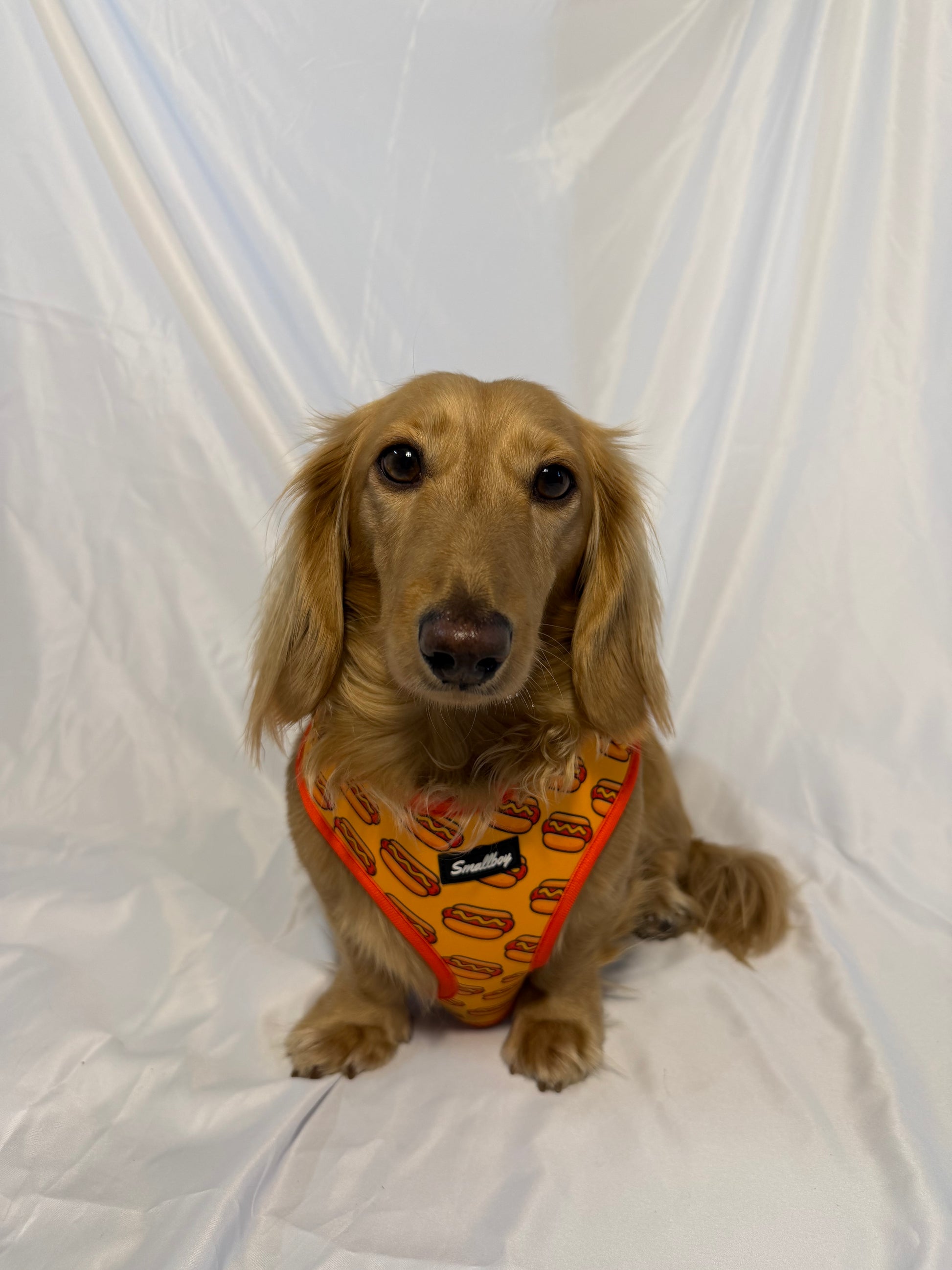 Turn every walk into a statement with the Hot Dog Adjustable Harness, featuring our all-over hotdog print on a bold mustard yellow base with bright orange trim, designed for dogs who like to stand out.