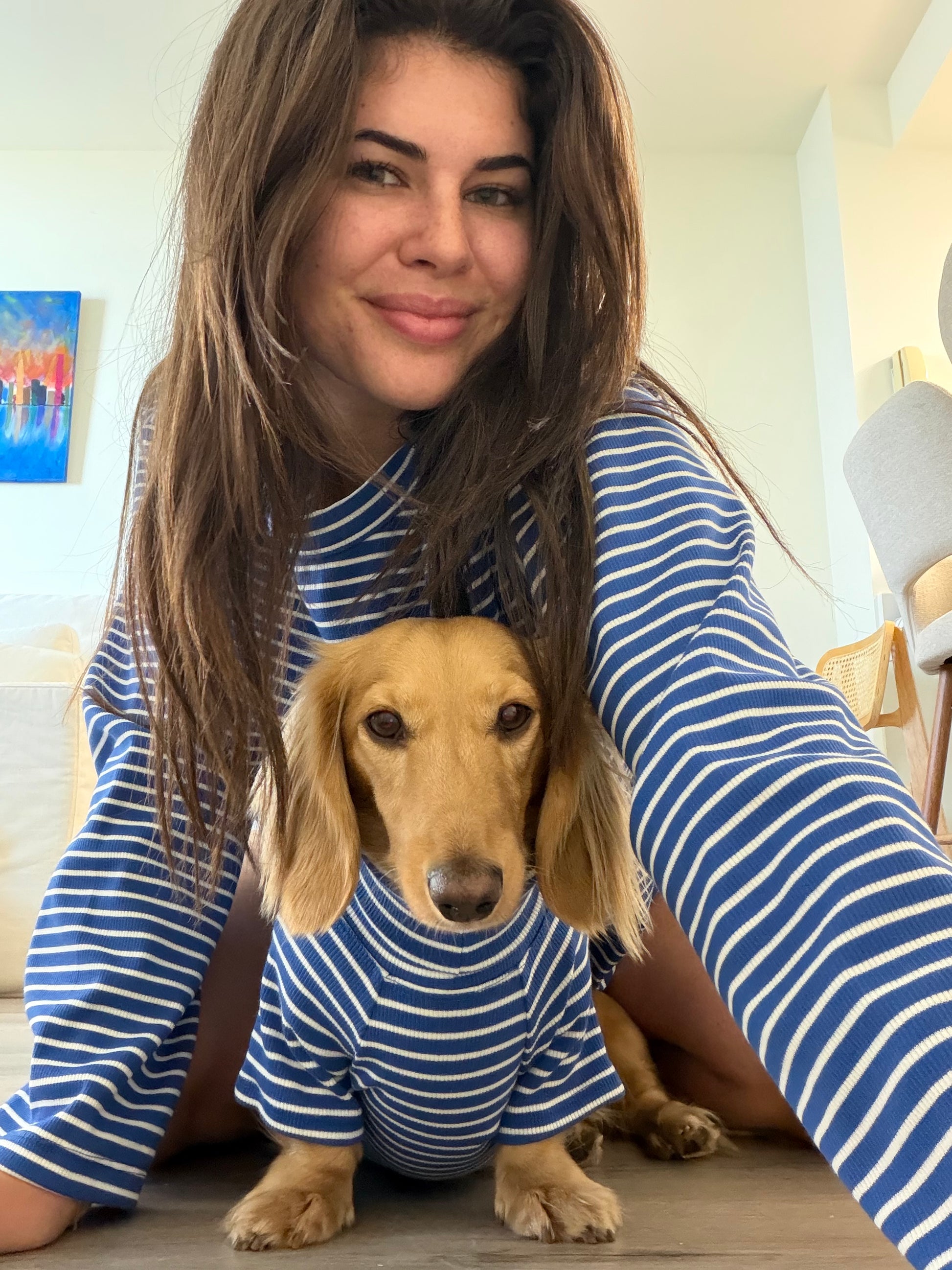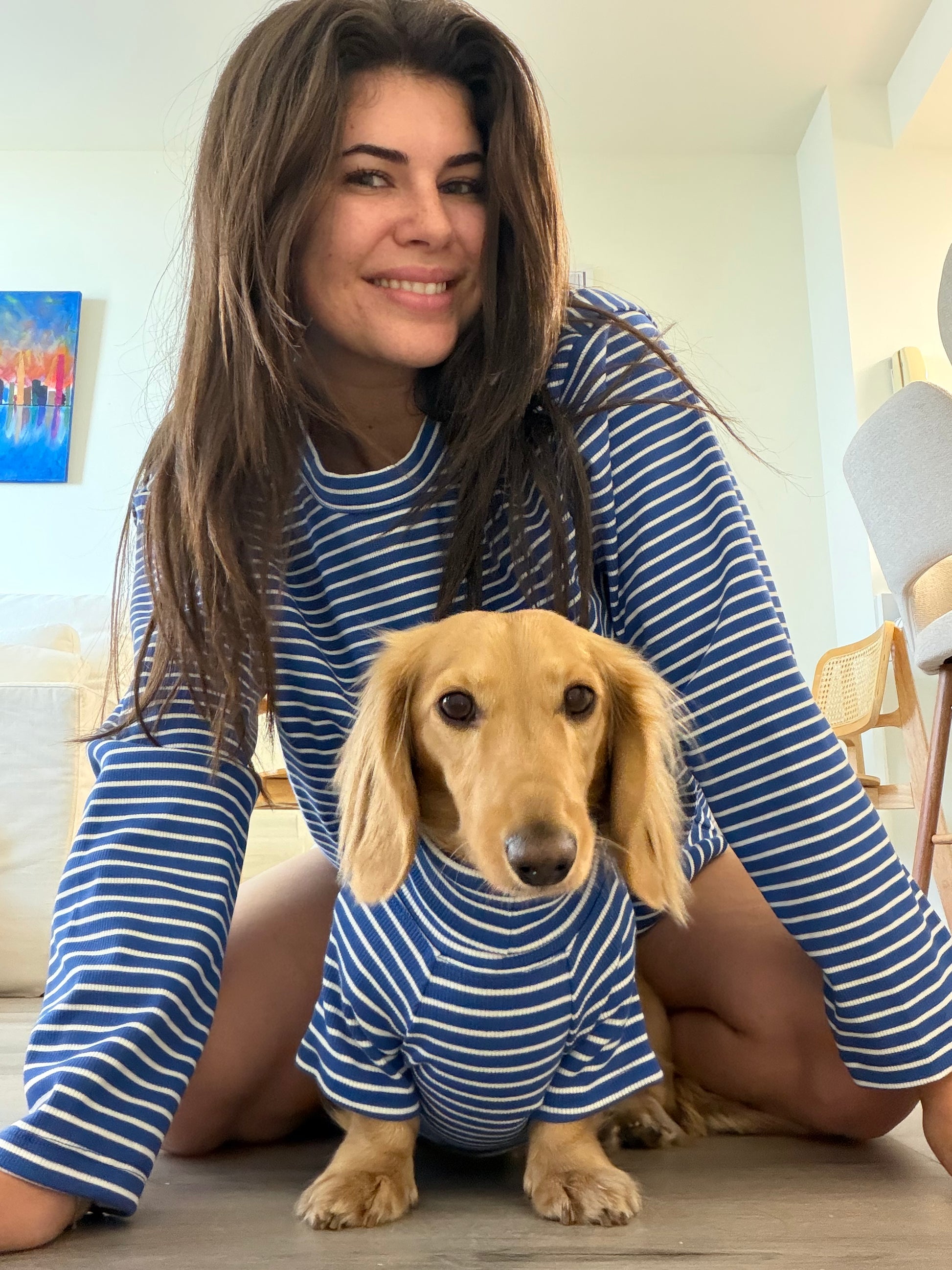 Fresh, timeless, and made to turn heads - The Ocean Breeze Matching Set brings coastal charm to both you and your pup. Featuring crisp navy stripes against a white base, this set captures the effortless feel of a breezy shoreline walk. Crafted from breathable ribbed fabric with just the right amount of stretch, it’s designed for comfort without sacrificing style.