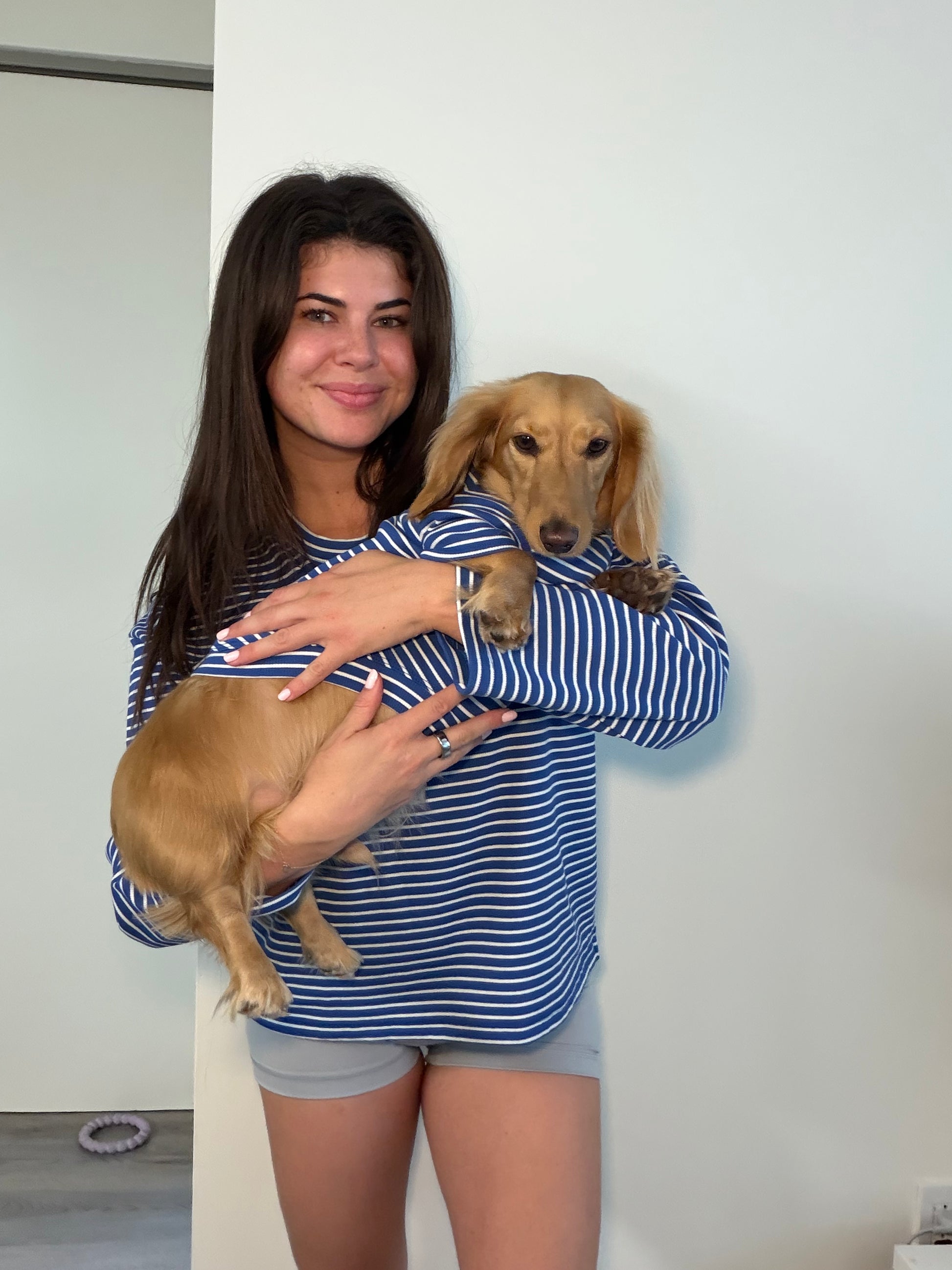 Our dog Charlie (pictured here) is a standard sized dachshund, wears a size small (and can fit into a medium, too) and weighs about 17.5lbs and I am wearing a S/M here.