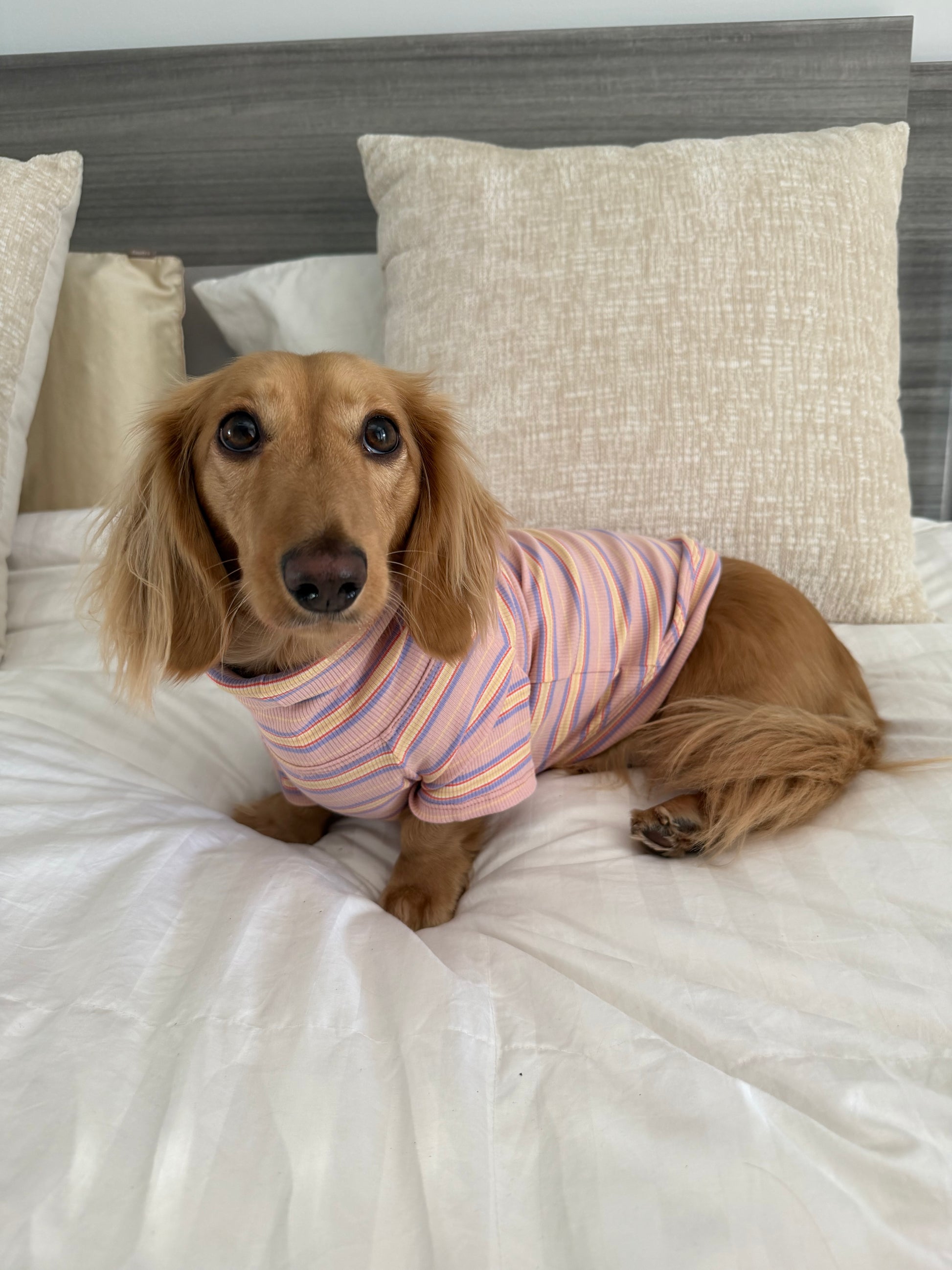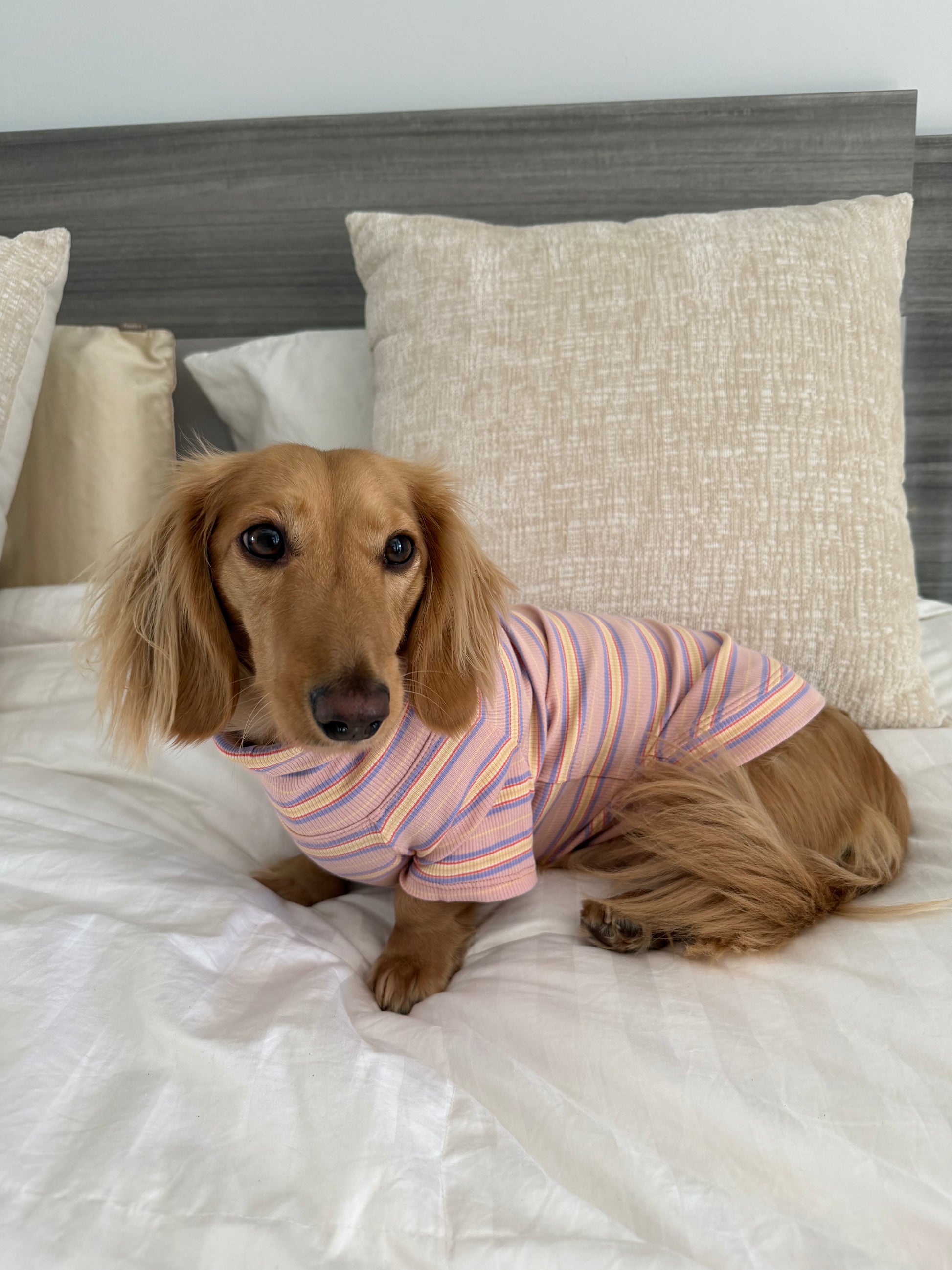 You and your pup’s new go-to for cozy days and golden-hour strolls. The Sunset Sorbet Dog Shirt blends playful charm with a dreamy pastel vibe, featuring soft, ribbed fabric in lavender-pink with warm rainbow stripes. Designed for pups who love to look sweet, stylish, and effortlessly cool (and for humans who appreciate a perfect, aesthetic pastel moment).