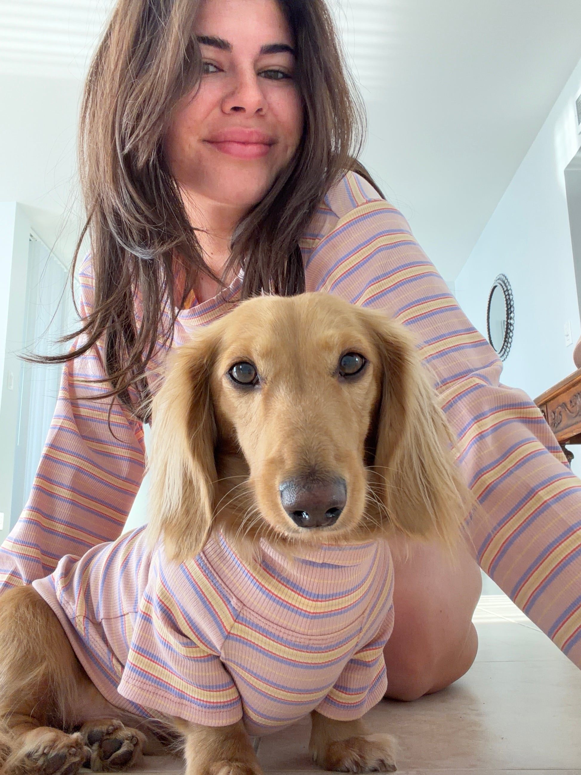 Our dog Charlie (pictured here) is a standard sized dachshund, wears a size small (and can fit into a medium, too) and weighs about 17.5lbs and I am wearing a S/M here.